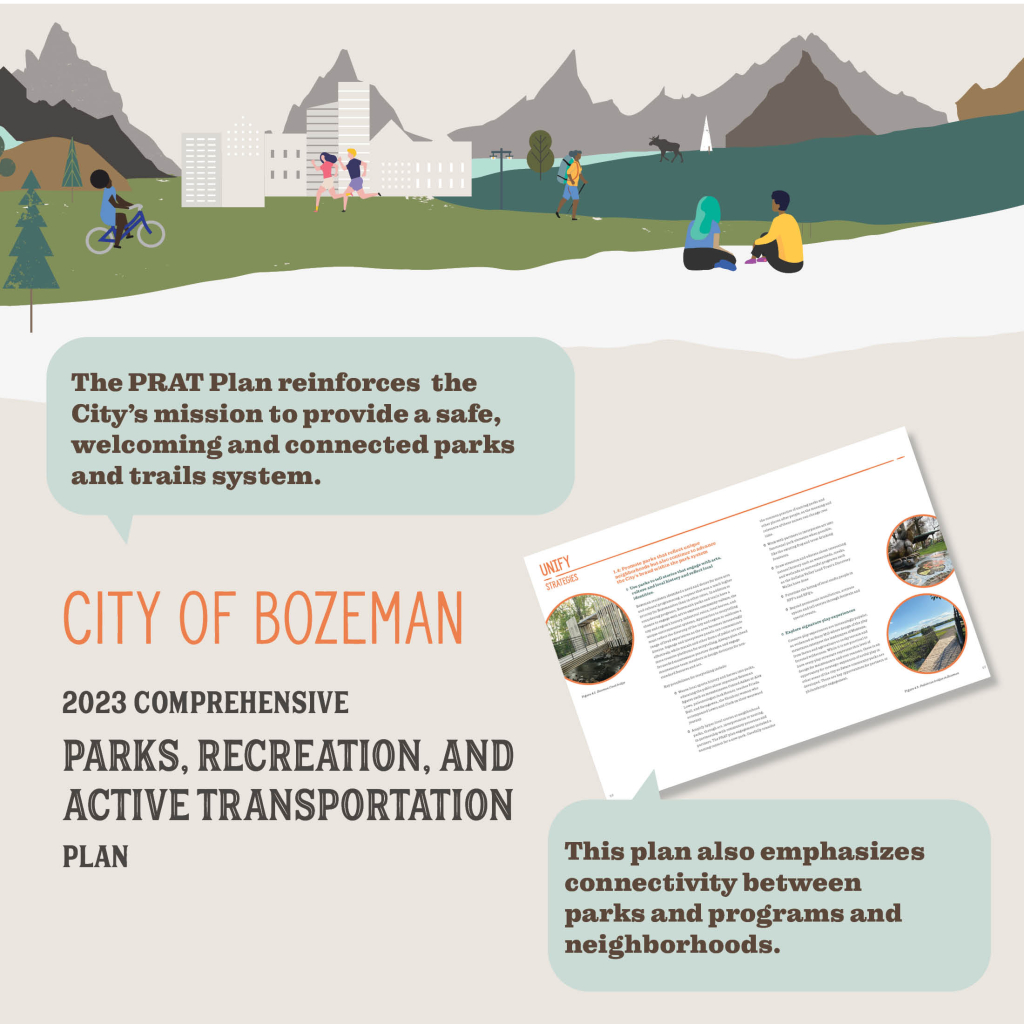 We are so excited to share that the Bozeman Parks, Recreation, and Active Transportation Plan (PRAT) is here! The PRAT plan is driven by community ideas – residents contributed comments and suggestions over the last 14 months to shape future investments! The plan identifies a vision and realistic, actionable goals for the City’s most valued places – its parks, trails, and recreation facilities.