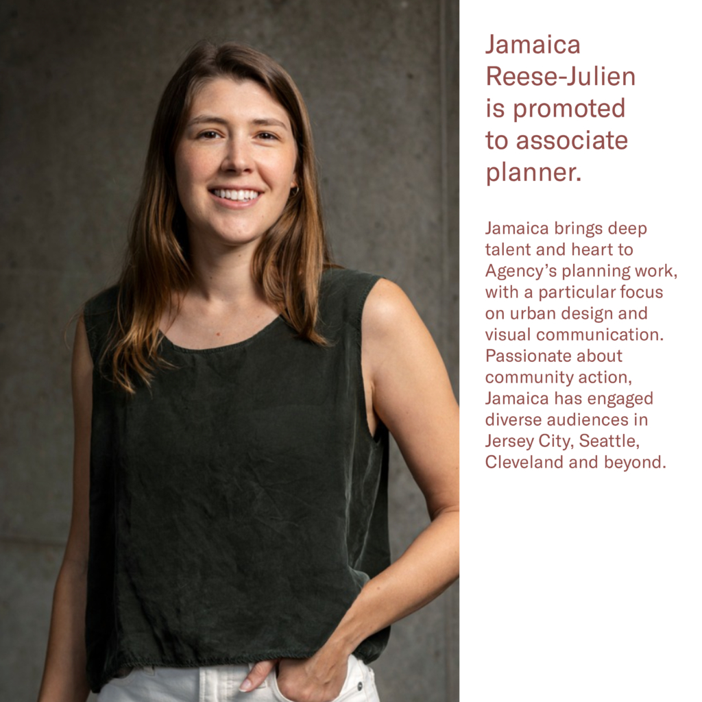 Jamaica brings deep talent and heart to Agency’s planning work, with a particular focus on urban design and visual communication. Passionate about community action, Jamaica has engaged diverse audiences in Jersey City, Seattle, Cleveland and beyond.