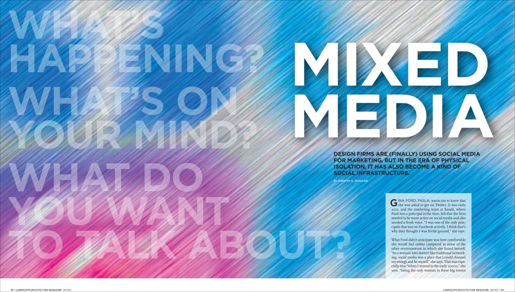 We are proud to share more about our social media story and presence in “Mixed Media”, an article about social media in the design community by Tim Schuler in the January 2021 issue of Landscape Architecture Magazine. Gina spoke with Tim about her personal journey with social media, the origin story of Agency and our relationship with social media, and the distinct roles of different social media platforms.