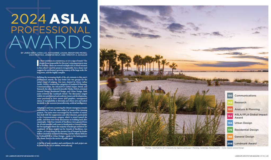 Read more about the project, our diverse team of collaborators and award here, as well as in the month’s Landscape Architecture Magazine! We will be accepting this award on behalf of the Bay Park Conservancy, the Sarasota community and our incredible design team in Washington DC at the Conference on Landscape Architecture on October 7th of this year.