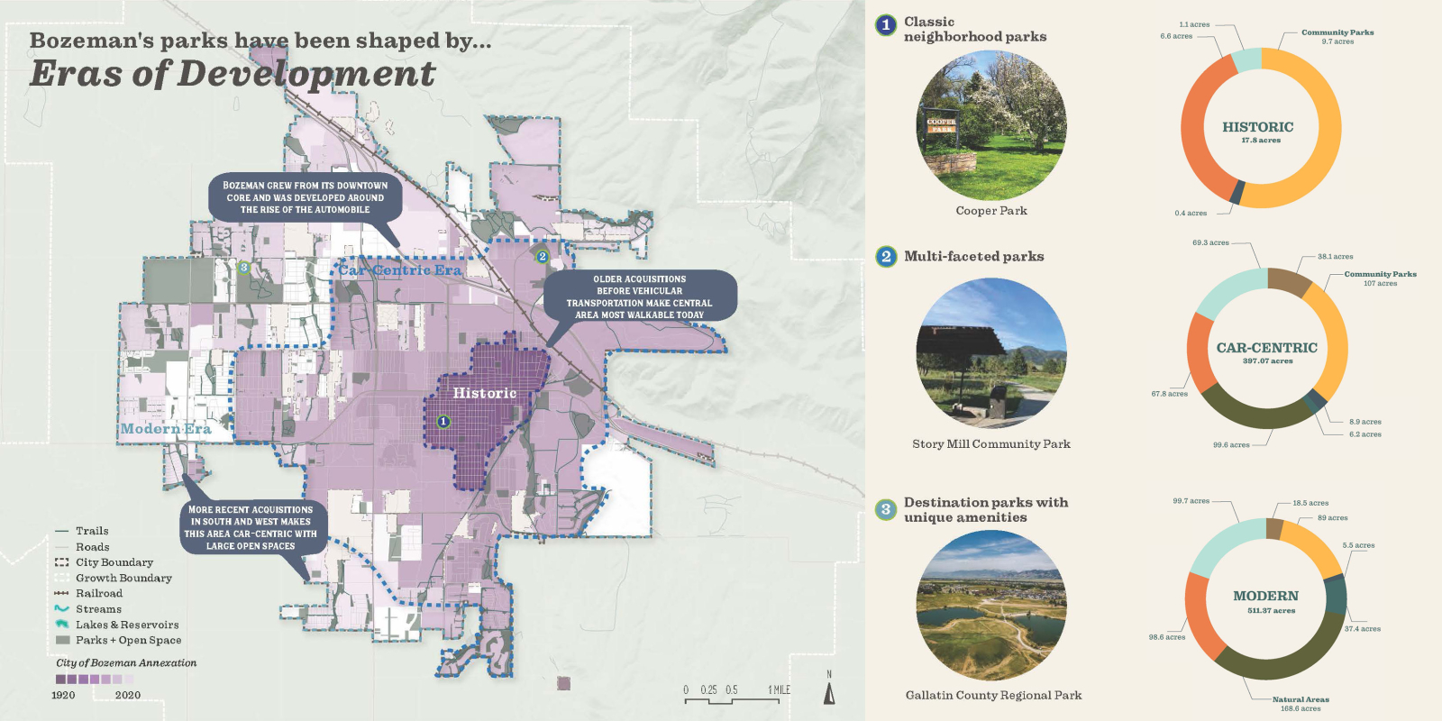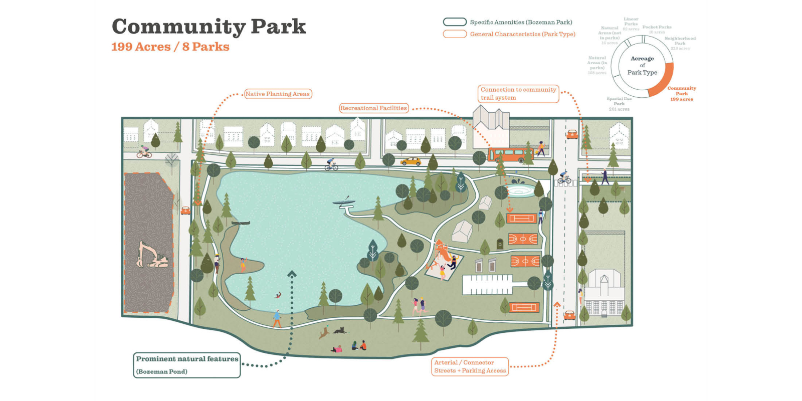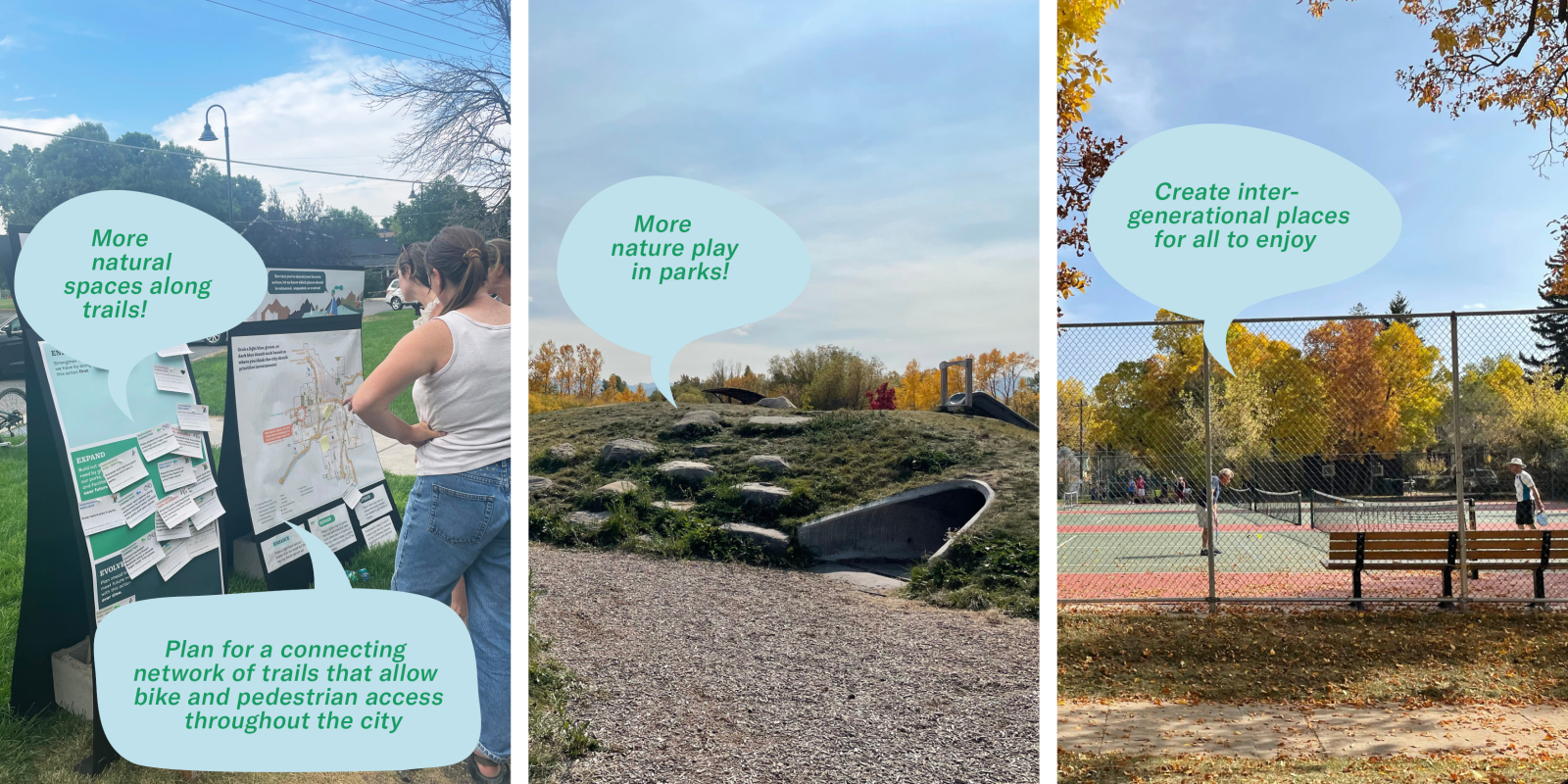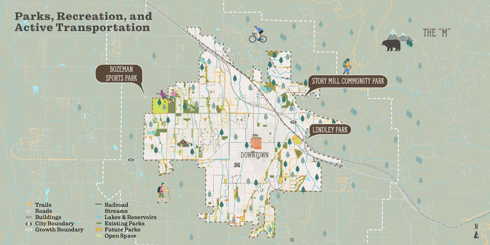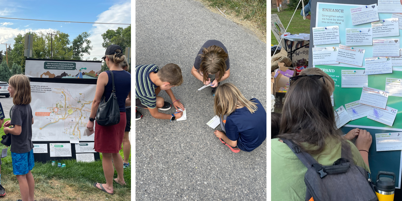 The plan is built upon a thorough and distributed community engagement process alongside comprehensive mapping to understand and identify places where investment could have the largest impact on Bozeman residents, future growth, and land conservation. Engagement methods included more traditional methods of outreach (workshops, pop-up events, Bang the Table, and a statistically valid survey) alongside a collaborative effort between this plan and a Safe Routes to Parks grant, which included community-led conversations with Black residents, Latinx residents, and the disability community. Feedback pointed to continued support for connectivity, safe access between homes and parks and trails, a desire for fun and inviting spaces that adapt to climate change, and a well-maintained system – all of which were combined into six goals that frame the plan’s recommendations.
