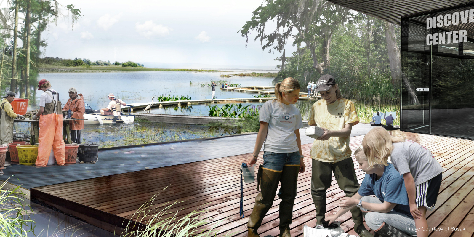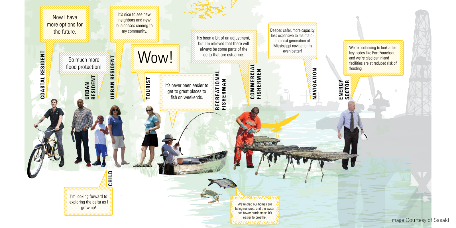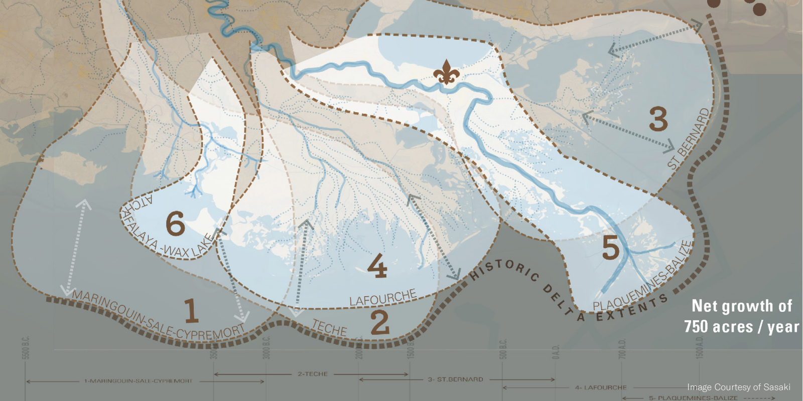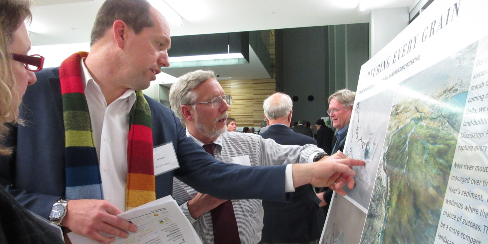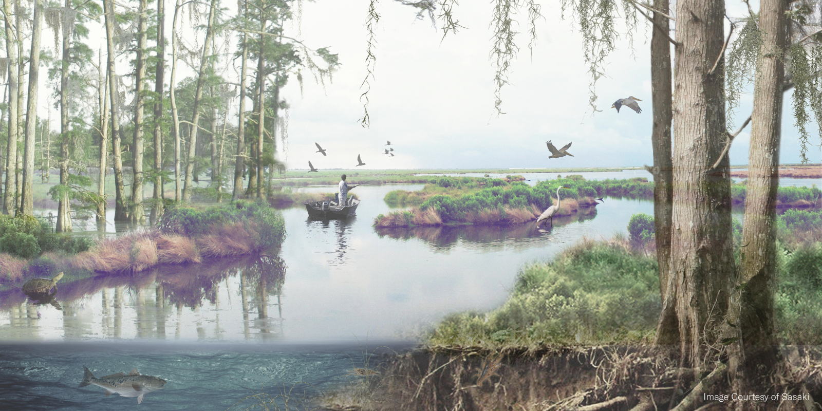 The wetland landscape of the Gulf Coast south of New Orleans is home to some of the most significant shipping infrastructure, productive fishing and aquaculture and unique cultures and communities in our nation. It also provides a critical buffer to storm surge to the inland communities from the region’s exposure to hurricanes. At the same time, land subsidence, increasing storm threats and sea level rise are taking its toll – with nearly a football field sized patch of wetland lost to the sea each and every day. The Changing Course Competition asked the world’s experts to develop out-of-box ideas to address the significant challenges of the region.