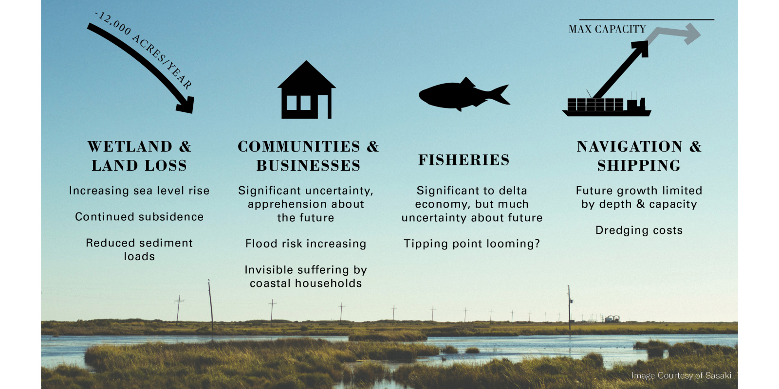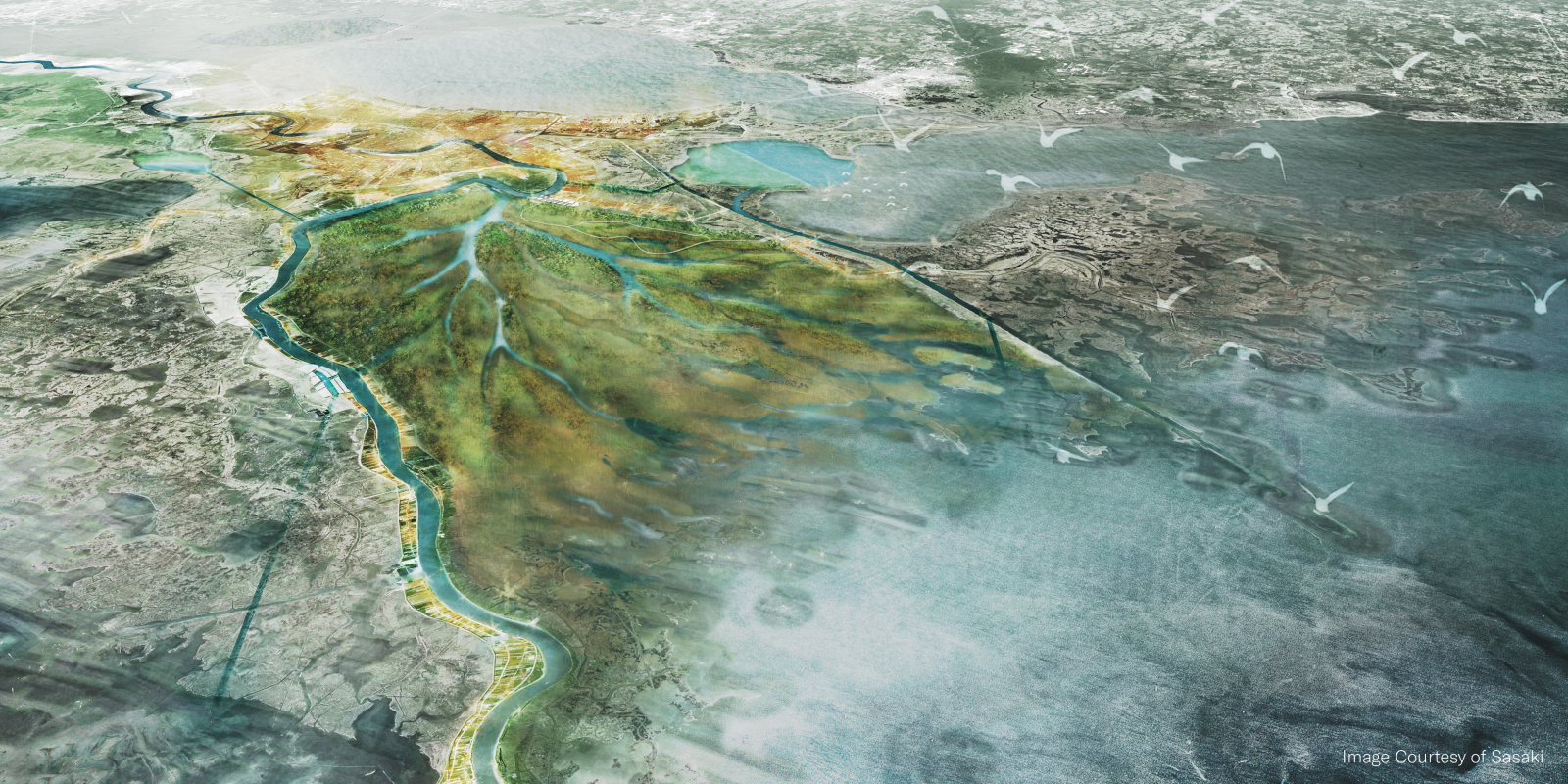 Gina Ford led Sasaki’s participation in the competition – focusing on visual communication, cultural considerations and economic impacts – on the Baird Associates team, which also included many technical and academic partners to address the complex inter-related scientific and cultural context. Baird’s strategy – called “A Delta for All” – introduced bold, large-scale engineering infrastructures to maximize sediment capture and create immediate benefits of flood-risk reduction, shipping reliability and efficiency and increased ecological tourism. The proposal also put forward new policy and funding strategies to enable managed retreat from the highest-risk areas over time.