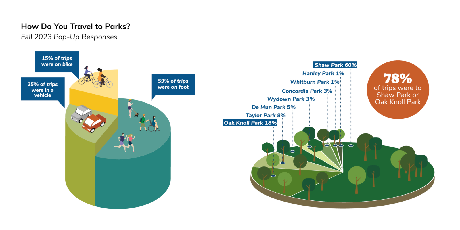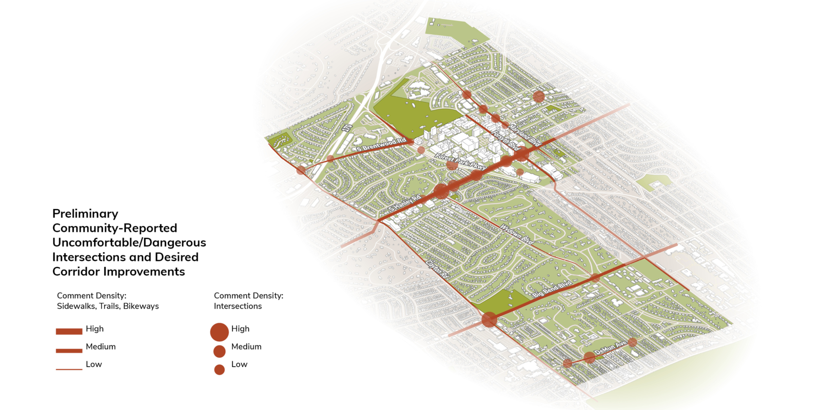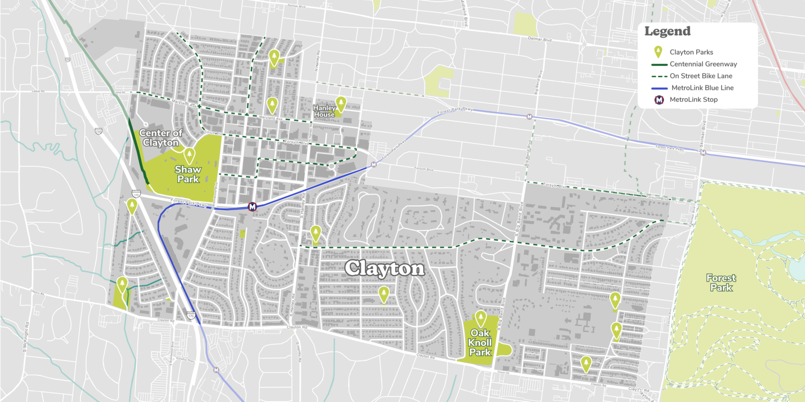 Clayton, Missouri is an employment hub in the St. Louis area known for its bucolic private residential developments. Combining an active downtown with regionally beloved parks, it is recognized for its high quality of life, boasting a top school district and renowned events like the nationally-recognized St. Louis Art Fair. Clayton is a small municipality with a resident population of 17,000 that grows to almost 50,000 during the work week. As a small, dense city, Clayton has enormous potential to be a world class walking, biking, and public transportation hub, but as a car-centric outer ring community, its existing infrastructure does not meet the community’s growing need for safe connectivity today. Clayton’s parks are well maintained and regularly renovated; its largest, Shaw Park, draws crowds from around the metro area.