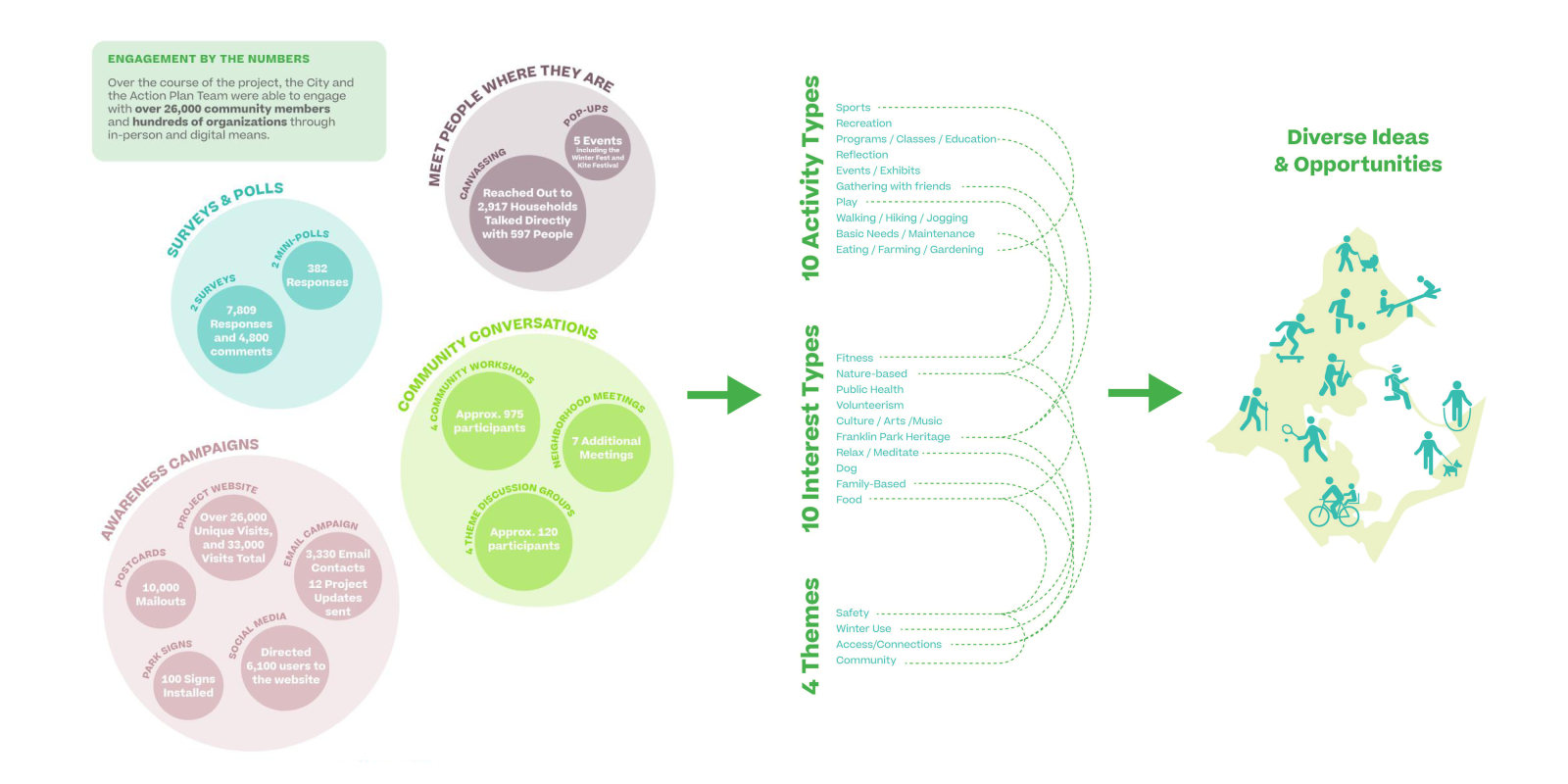 Throughout this 18-month project which commenced in Fall 2019, the team undertook an equitable and inclusive planning and decision-making process to create a shared vision for the future of Franklin Park. Our work built on previous planning efforts and improvements by the City and its partners. Throughout the master plan process, the team visited Franklin Park and the surrounding communities for community workshops, pop-up activities, surveys, and conversations with the park’s neighbors.