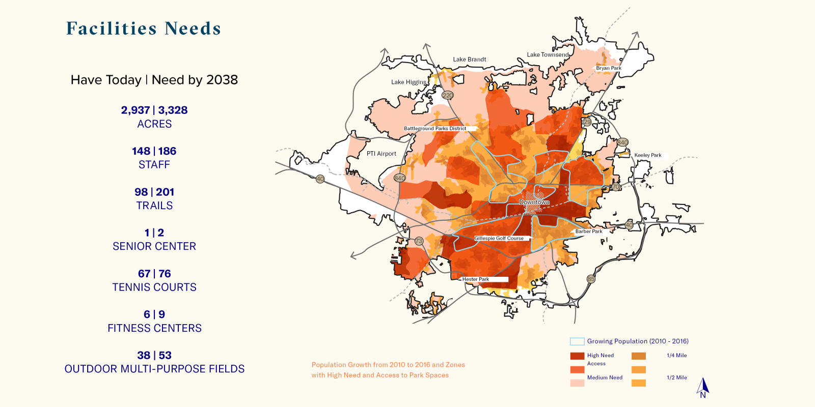 The project team began with a thorough analysis of the City’s parks and recreation system, and in parallel, has initiated a series of community conversations to understand the priorities of Greensboro’s culturally diverse and evolving population. Early findings pointed to continued support for connectivity and neighborhood-scale amenities, as well as investment in state-of-the-art facilities. The team is excited to help the City chart a progressive path forward amidst growth and development, unique neighborhood needs, environmental conditions, and a competitive funding/financing context.