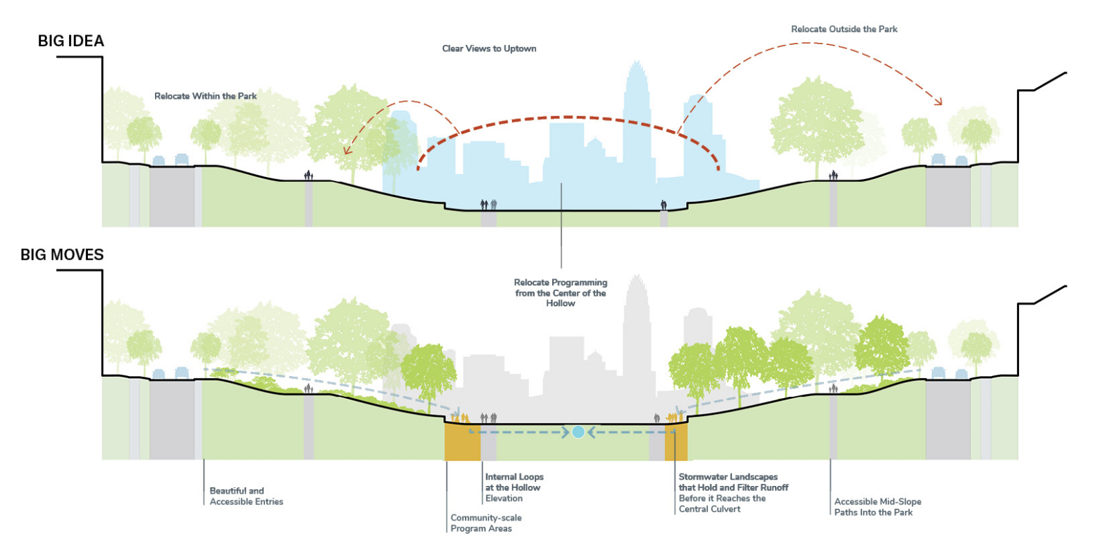 With Agency at the lead of this planning and design effort, the project aims to reintroduce a sense of spatial and historic continuity, celebrating the park’s legacy, ongoing use-patterns and the spectacular views it affords to Charlotte’s uptown. Agency Landscape + Planning, partnered with Citizen Design, Bloc Engineering, RMF, The Cultural Landscape Foundation, History South, Bartlett Tree Experts, Perkins + Will, and Revington Reeves, under the guidance of Mecklenburg County Parks, is conducting ongoing analysis, master planning, public engagement, design and construction administration efforts.