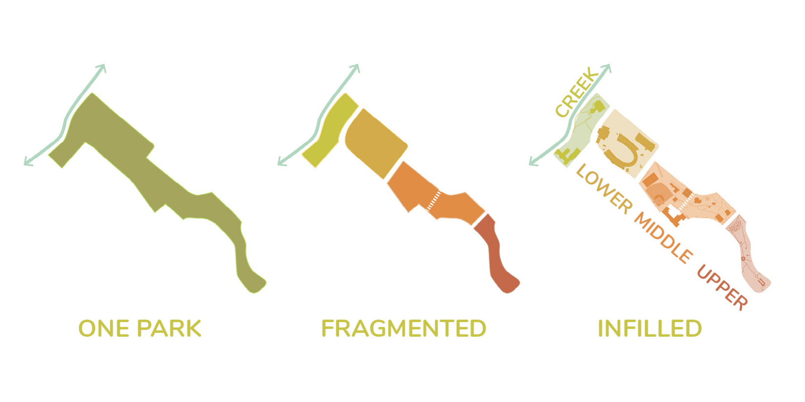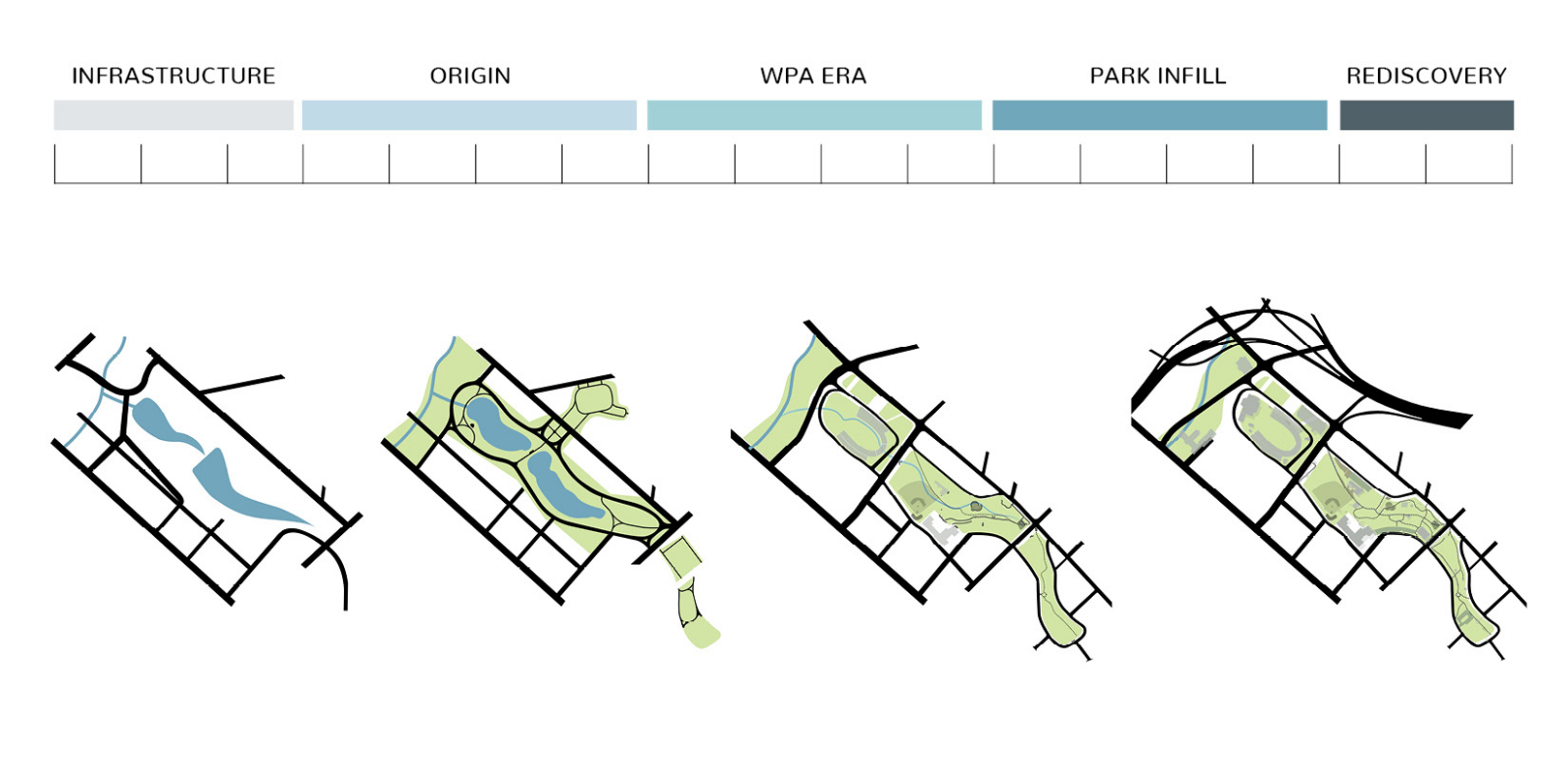 Independence Park was initially conceived of by landscape architect John Nolen as a continuous park that epitomized the “spirit of informality” as it spanned the length of a winding hollow to its confluence with Little Sugar Creek. Today it exists as a series of disassociated parts, bisected by the construction of roads, and infilled with institutional buildings. Nolen’s unrealized plan for Independence Park envisioned the site’s two original reservoirs encircled by continuous tree-lined pedestrian promenades. The park was originally designed using a limited palette of elements: trees, landform, water and stone. Today, it reflects some aspects of this early vision, but it also features many incremental additions that in aggregate undermine the integrity of its character.