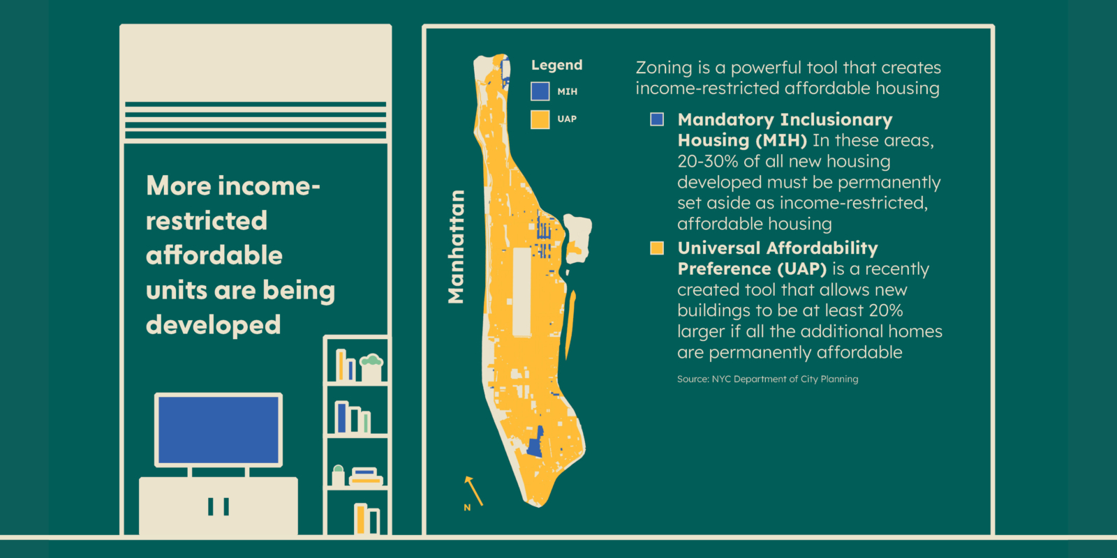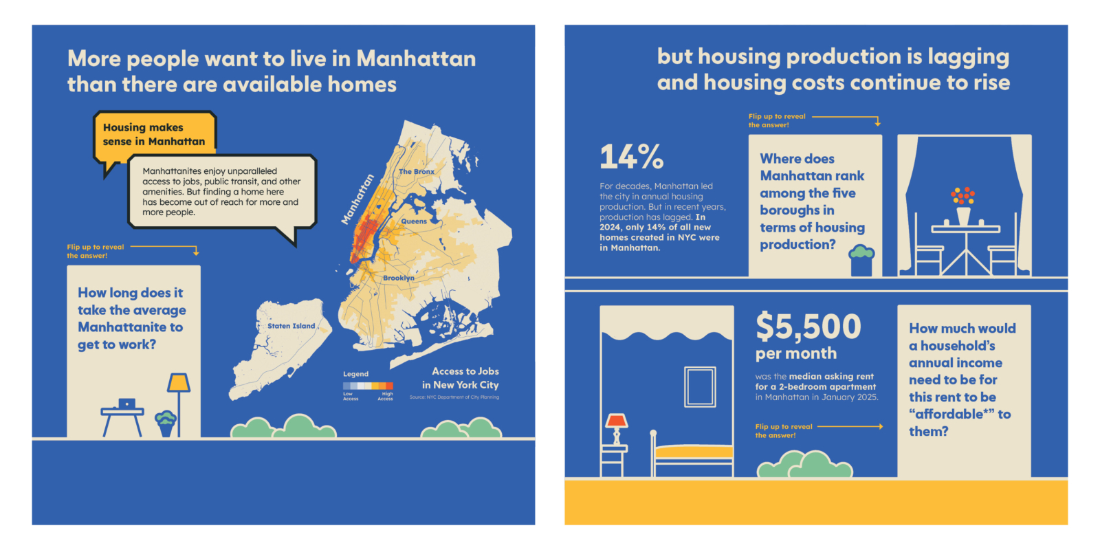 The Manhattan Plan is an initiative to address NYC’s housing crisis by adding 100,000 new homes to Manhattan over the next decade. In order to develop a toolkit of strategies that can achieve this goal, the NYC Department of City Planning launched a planning and engagement process to hear from community members and stakeholders across Manhattan. The intention is to hear thoughts from Manhattanites from all neighborhoods about what’s important to them, where housing should go, and to share ideas for how to get to 100,000 new homes.
