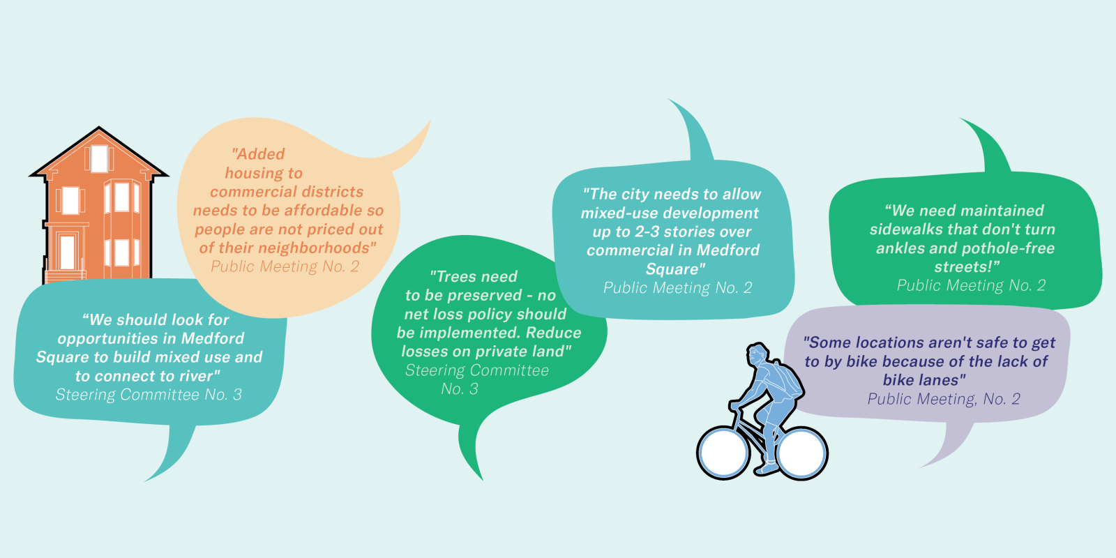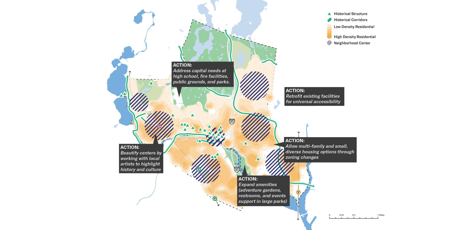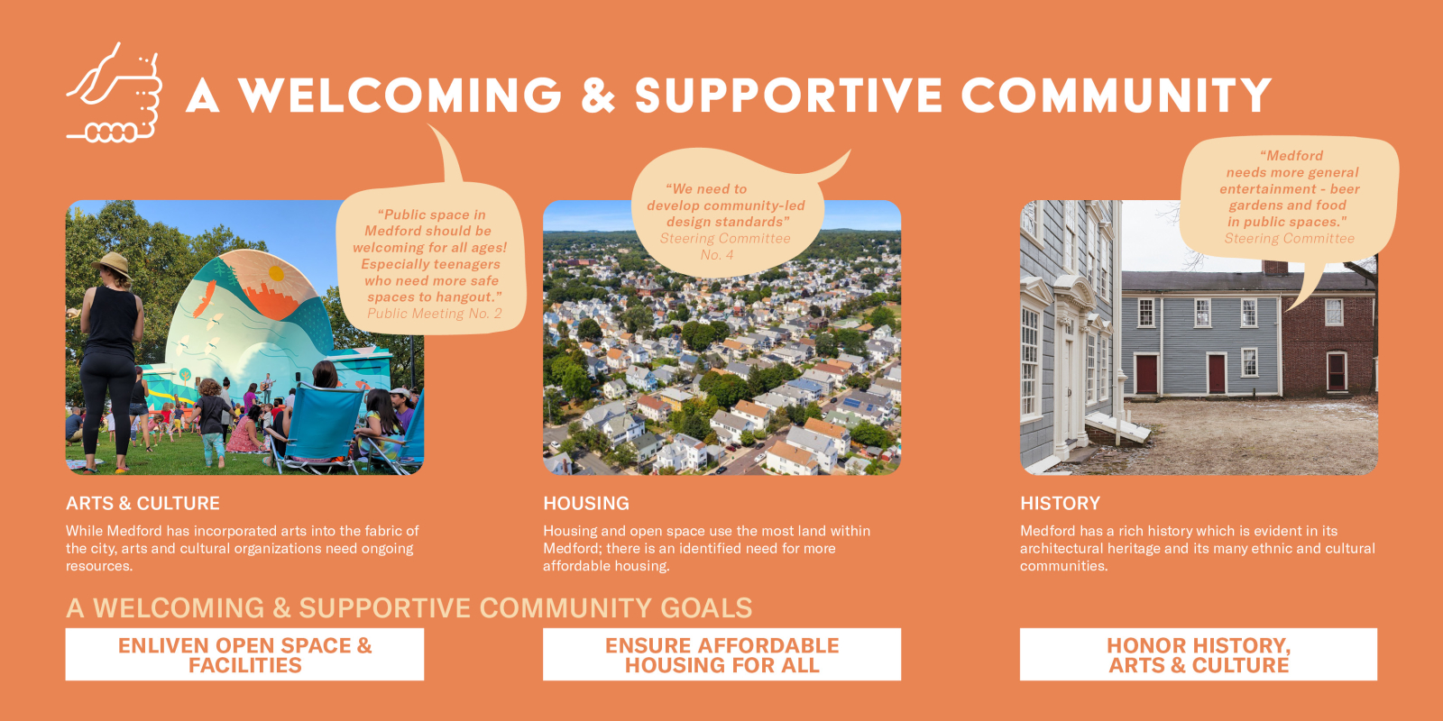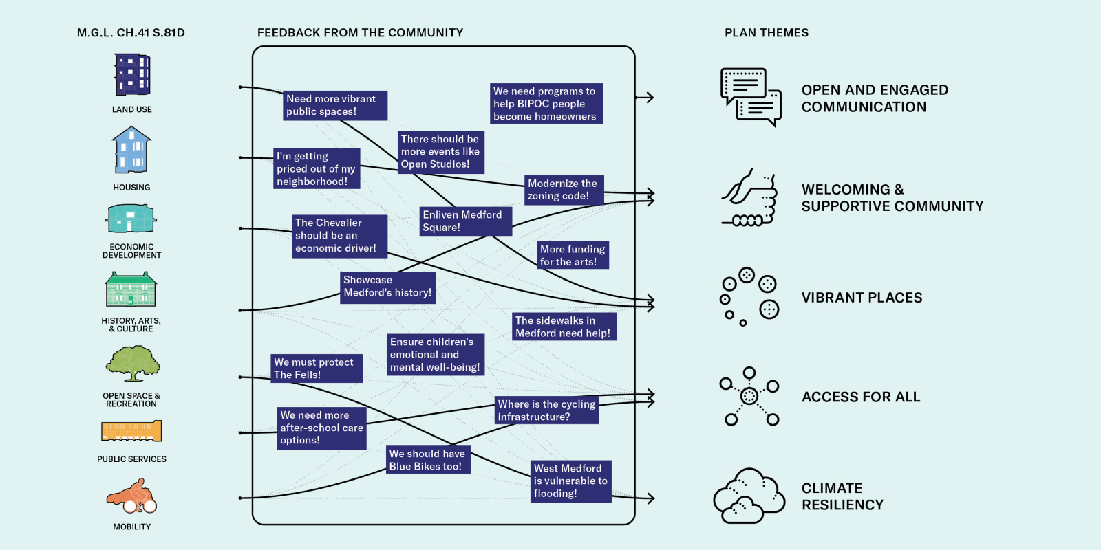 The Plan’s goals, objectives, and actions are structured around five overarching themes that we heard from Medford residents, visitors, workers, and stakeholders: