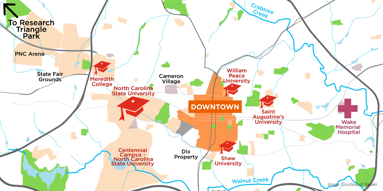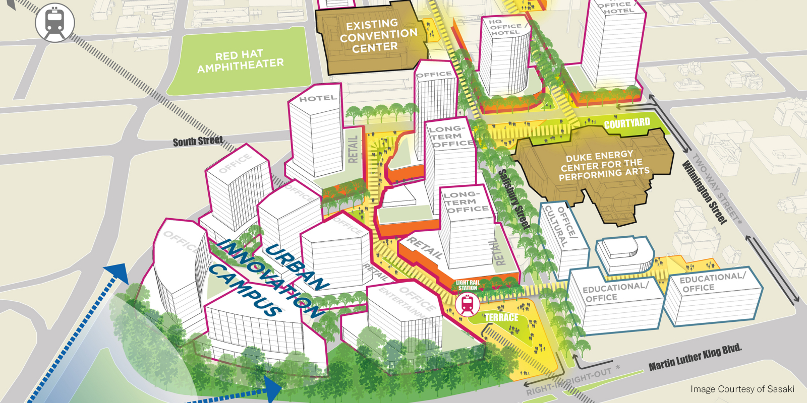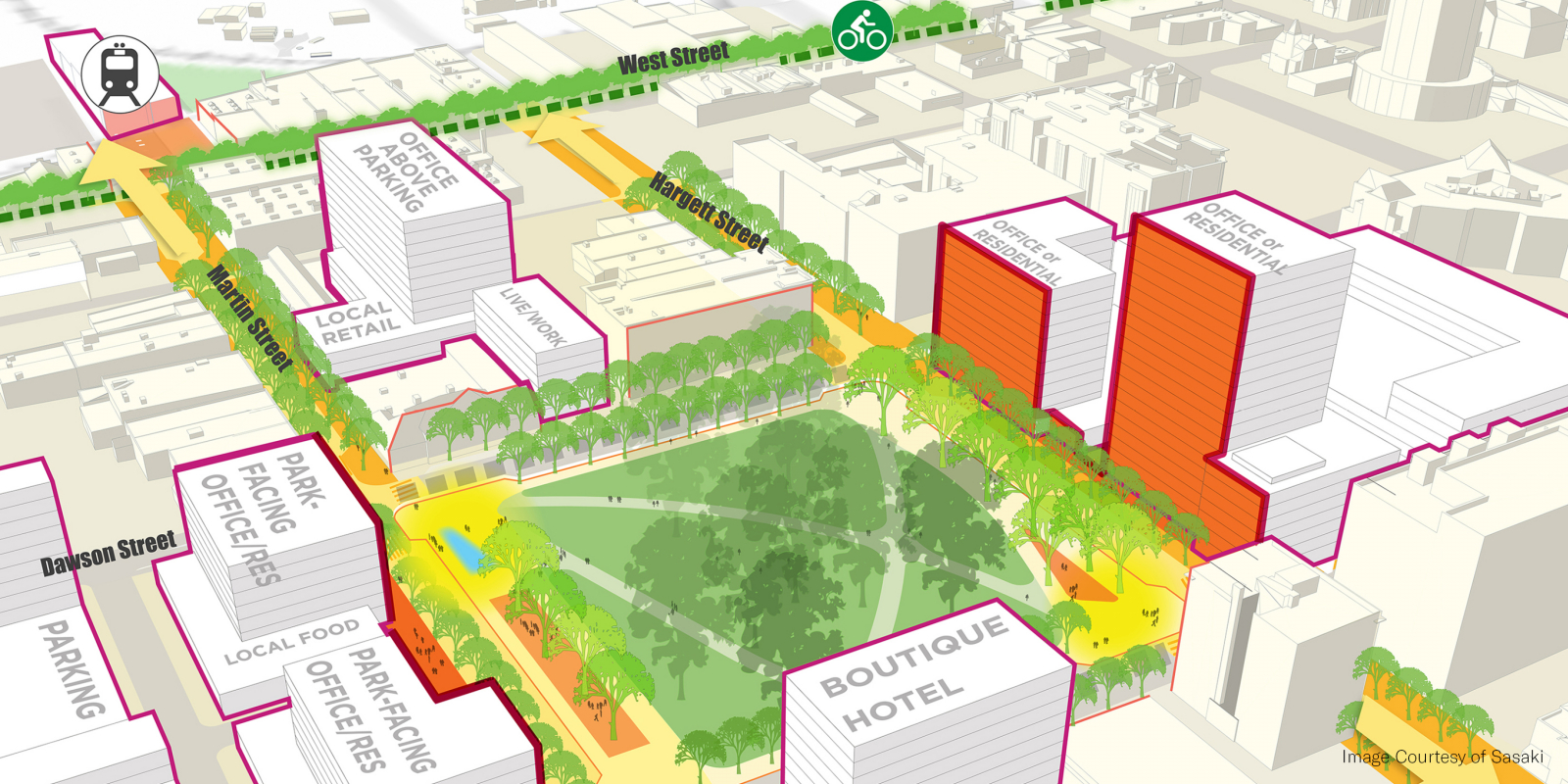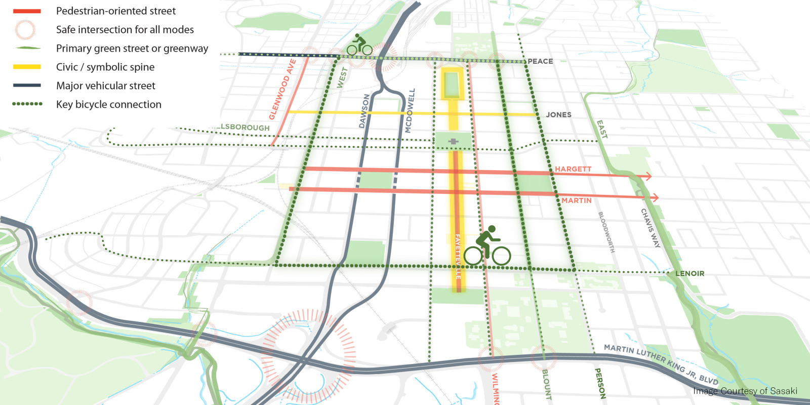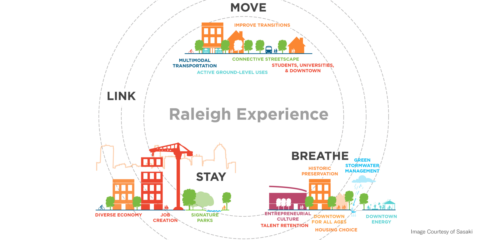 Over the course of a year, hundreds of people helped to create the plan by sharing their ideas through community meetings, brainstorming sessions, stakeholder debates, festival events and online dialogues. Engagement strategies ranged from large public meetings to small stakeholder roundtables, online surveys, project web page updates, MindMixer social media engagement, email notifications, YouTube videos, and Twitter posts. Brie Hensold served as the project manager for the plan while at Sasaki. The Downtown Experience Plan positions the city to capitalize on its projected growth and remain competitive through reinforcement of neighborhood character, catalytic development projects, mobility improvements and enhancements to the quality of the public realm and downtown park system. The plan’s projects, policies and programs seeks to create and maintain an inclusive, authentic downtown that is walkable, bikeable, and well-connected. They build on the best of Raleigh’s entrepreneurial spirit and sense of partnerships to make space for more creativity, design, and innovation in the coming years. With implementation as a priority, the ten-year plan establishes clear, achievable, and community-supported action items. Five catalytic projects were identified across downtown’s unique neighborhoods, including park renovations, new greenways, an urban innovation district and infill development sites. Implementation is underway on many identified projects, including a sensitive historic renovation of Moore Square park, designed by Gina Ford while a principal at Sasaki.