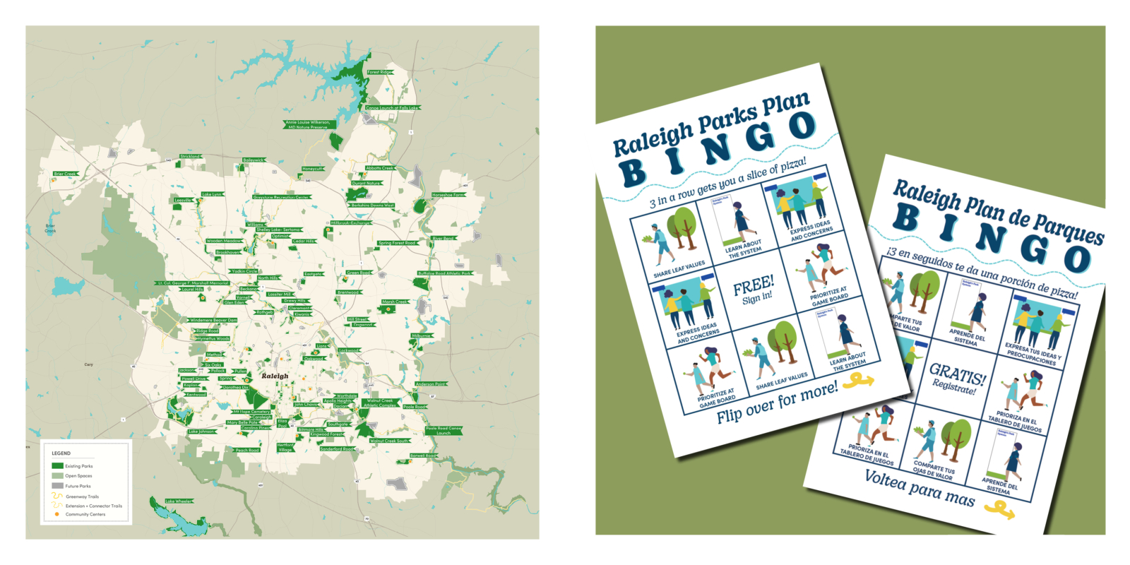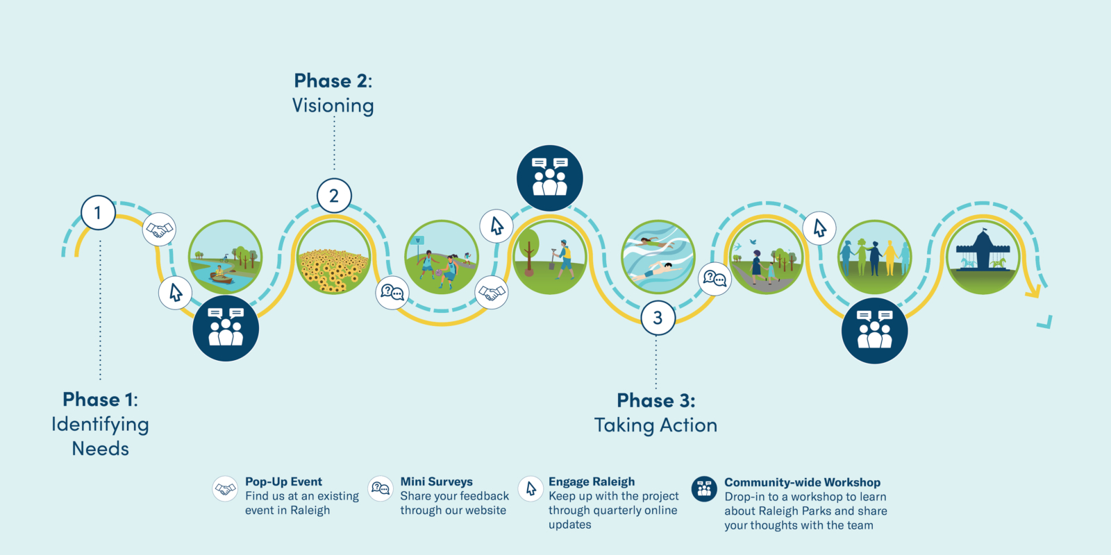 The Parks Plan Update will guide equitable investments for the City’s parks, nature preserves, greenways, facilities, and programs. Over a 12-month planning process, our team will complete three major engagement milestones, which will include pop-up events, community-wide workshops, online updates, and mini-surveys. This engagement is critical to the plan update, and will allow us to understand what nearby residents value about Raleigh’s parks and programs and what a future vision for the parks system could look like.