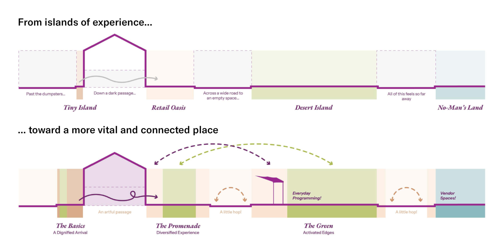 The draft vision plan rests on three principles: strengthen and restore the original design and function of the Square, ensure that retail can thrive in a challenging environment, and make Shaker Square both a Cleveland destination and a neighborhood-serving hub.