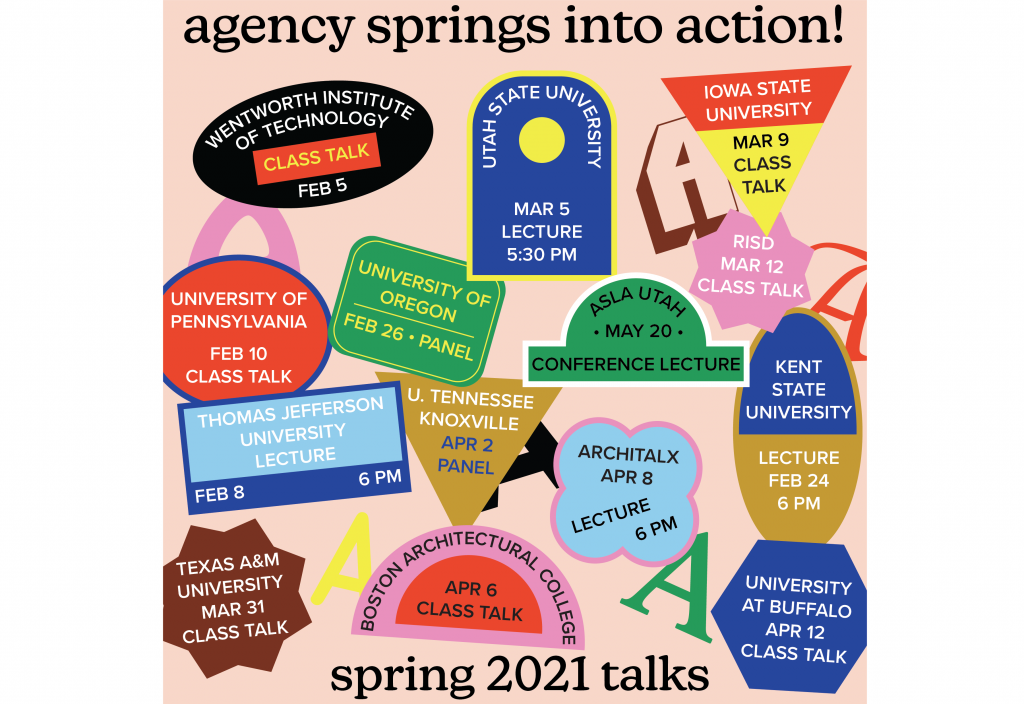 This spring, we have been joining virtual classrooms and lecture halls across the country to share Agency’s work and story. Upcoming talks: