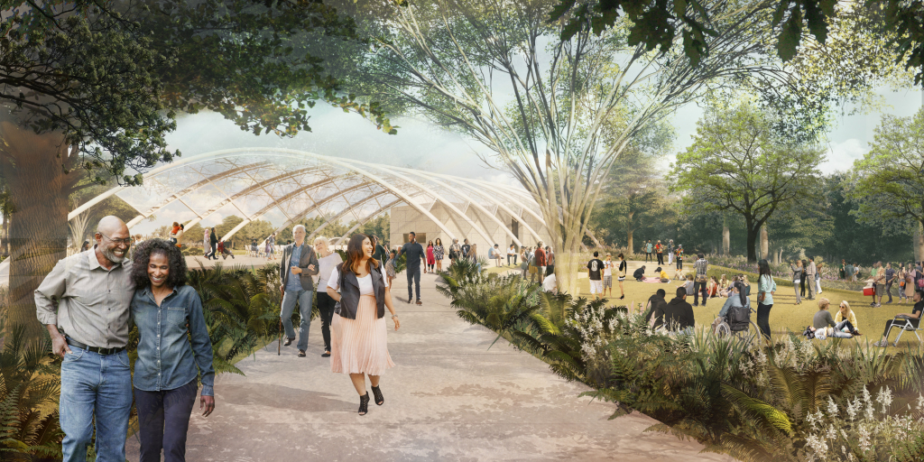 “Finding inspiration in the social aspects of [Field Theory], the park structures create innovative, shaded spaces for the public. Phase 1 of the 42-acre site will incorporate a pier, great lawn, shade structures, and food pavilion. At the edges of the great lawn, the architectural structures support public gathering spaces with generous areas for shade and shelter.” – Sweet Sparkman