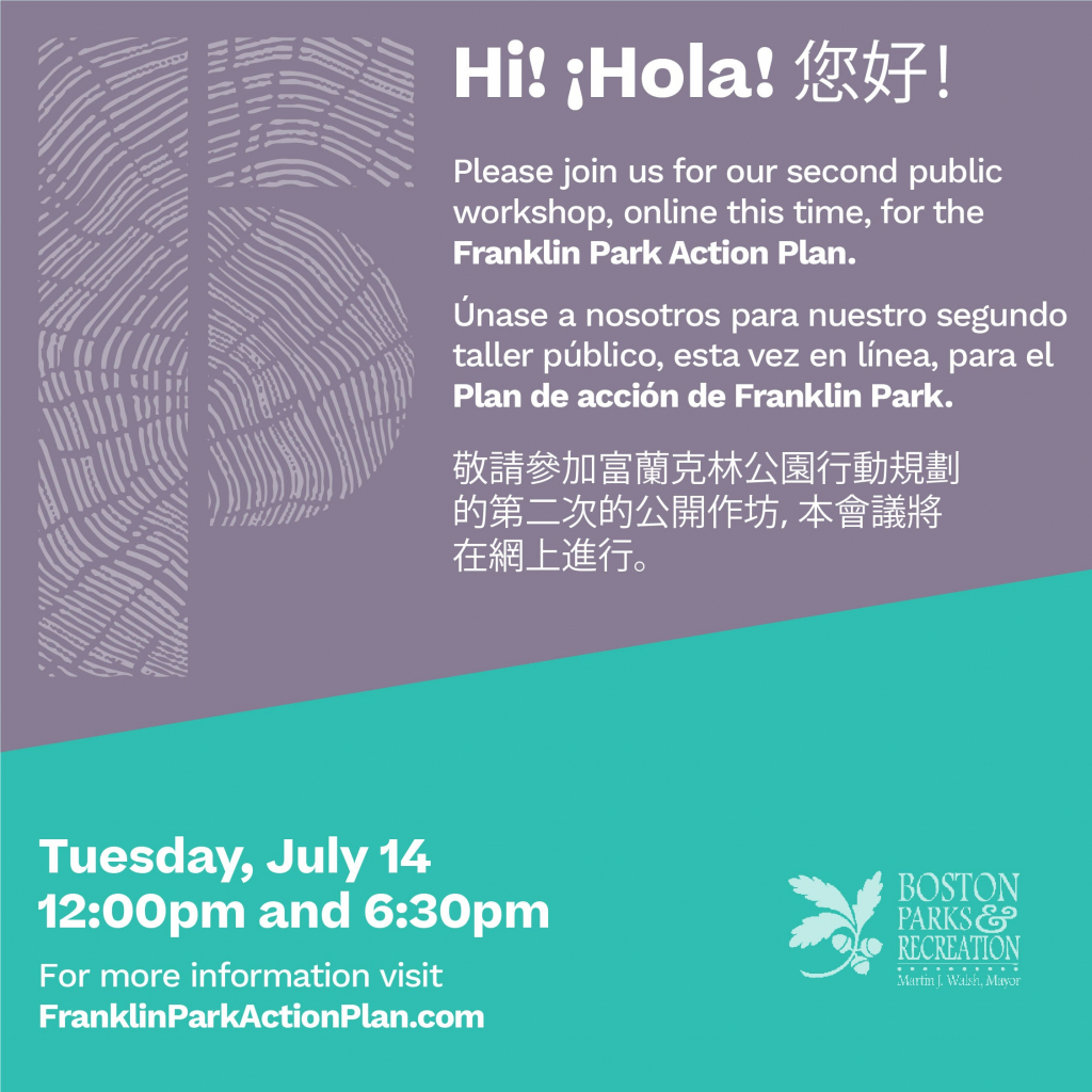 Join us for an online public workshop for the Franklin Park Action Plan, kicking off a month of summertime engagement: Tuesday, July 14th at 12:00 pm or 6:30 pm.