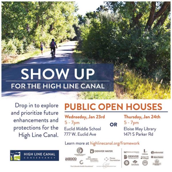 The Framework Plan has entered its final stage! Public input is needed to help guide the future of the High Line Canal. Join us, Livable Cities Studio and the High Line Canal Conservancy at a Community Open House January 23rd or 24th. Both community open houses will have identical information for review. Pick one that works best for you and drop in to share your thoughts and ideas.