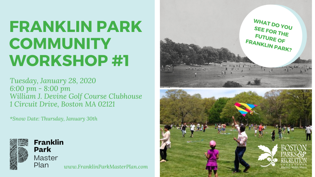 Join us for our first Community Workshop about the Franklin Park Master Plan next Tuesday, January 28, 6-8pm! We are supporting Boston Parks and Recreation and Reed Hilderbrand, along with MASS Design Group, among others, to understand previous planning efforts, what is working and isn’t working in the park, and what the neighborhoods around Franklin Park want to see in the future. We need your feedback, ideas, and diverse experiences to help create a master plan that best reflects your aspirations for Franklin Park.